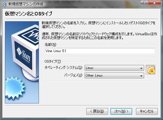新規>次>任意の名前(今回はVine Linux 5.1とした)