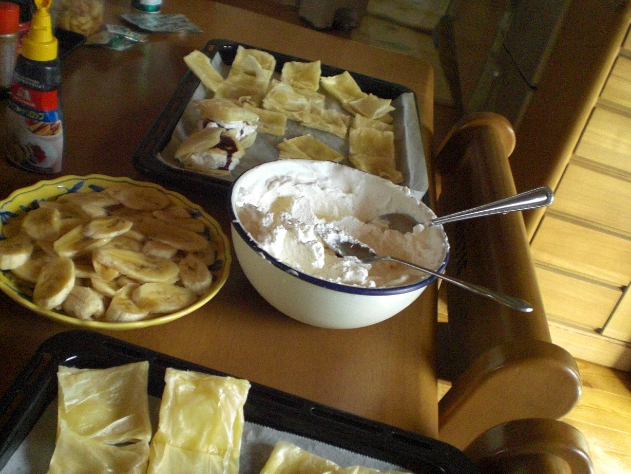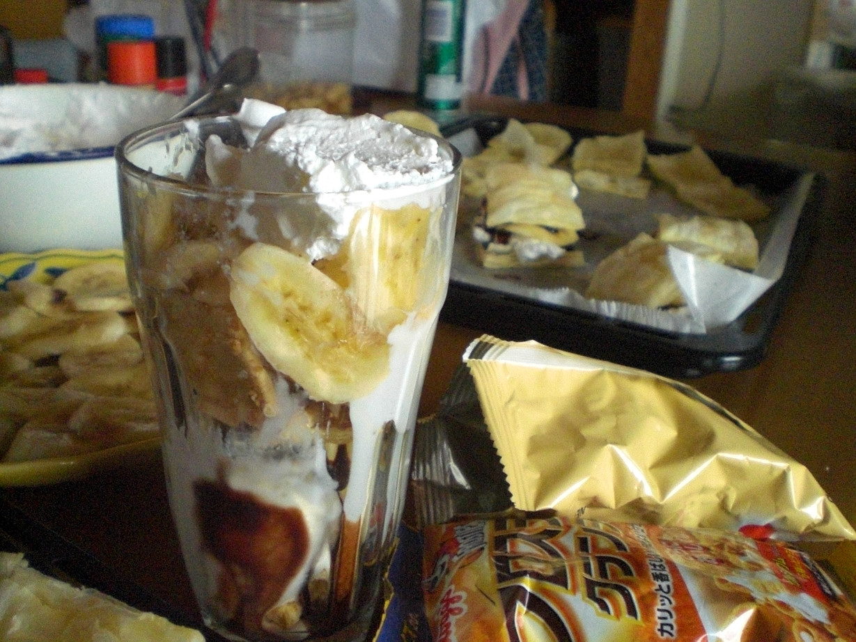 5.開いた中にホイップやらバナナやらチョコやら入れる。