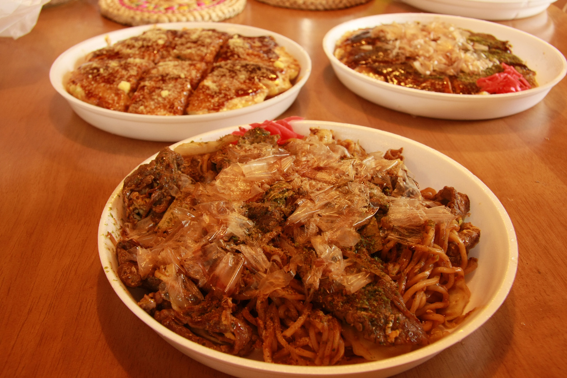 手前が焼きそば左がピザ、右がエビ